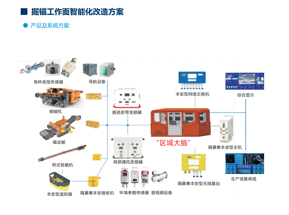 掘錨工作面智能化改造著眼于掘錨成套系統(tǒng)的整體智能化提升,通過升級掘錨機和錨桿轉(zhuǎn)載機電控系統(tǒng)(無需更換原有電控箱)、加裝傳感器;增加電液控制系統(tǒng);掘錨機和錨桿轉(zhuǎn)載機上增加導航定位系統(tǒng);增加掘錨機智能截割、自動對中行走控制系統(tǒng);增加錨桿轉(zhuǎn)載機智能跟機、自動對中行走控制系統(tǒng),搭建工作面網(wǎng)絡(luò)通信平臺。